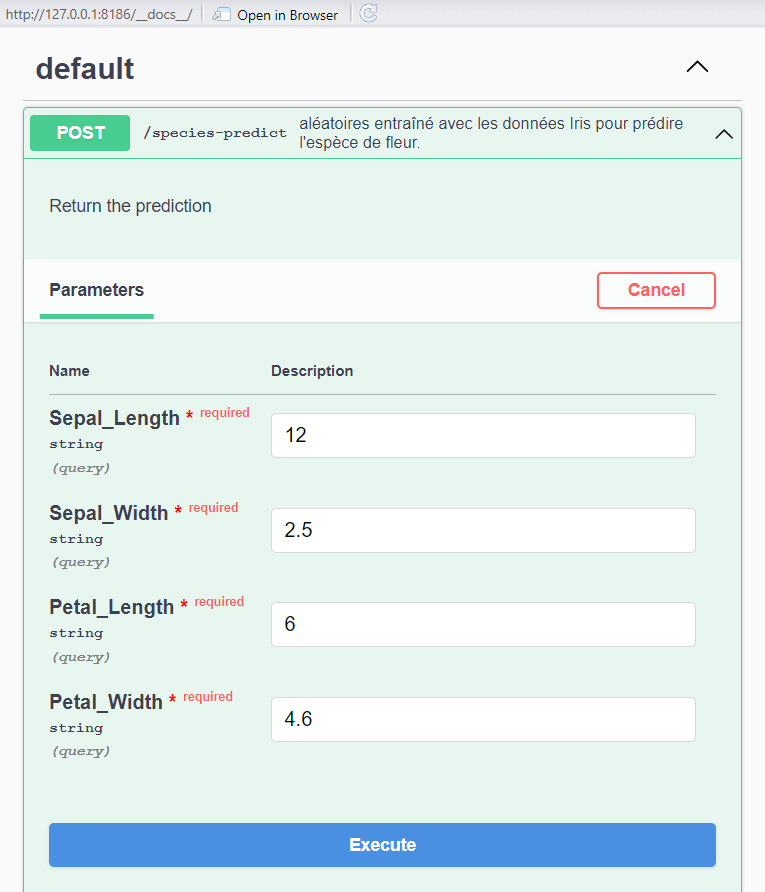 Pour accéder à la route POST où se trouve notre modèle, cliquez sur POST. Cela affiche les différents paramètres d’entré du modèle. Pour pouvoir introduire les valeurs de chaque paramètre, il suffit de cliquer sur “Try it out”.