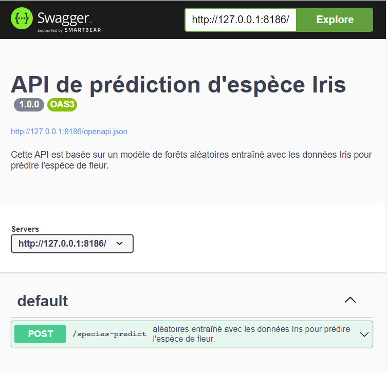 - Route de l’API (@post /species-predict) : Définit une route POST à l’URL /species-predict pour la prédiction des espèces. La route POST permet d’envoyer les données au serveur (par exemple soumettre un formulaire) et d’obtenir une réponse.