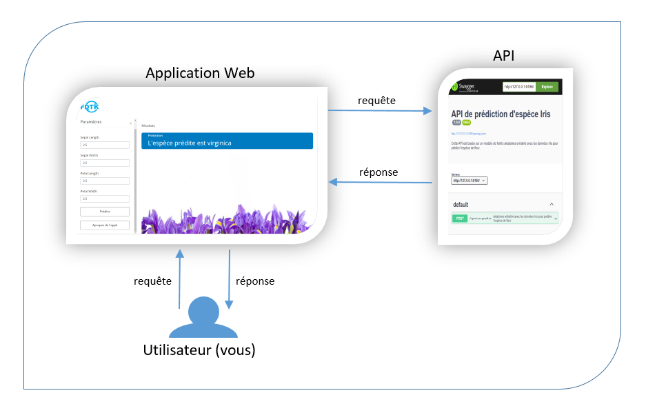 "À chaque prédiction, l'application envoie une requête à l'API qui retourne une réponse sous forme de chaîne de caractères contenant la classe prédite (setosa, virginica ou versicolor)", hr(),